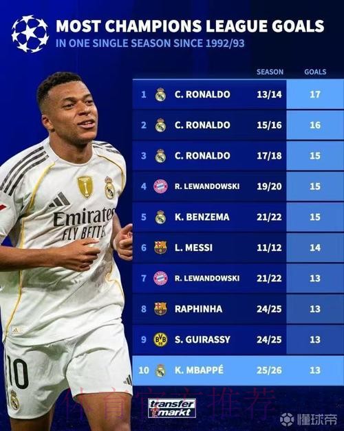 本赛季欧冠射门次数榜:姆巴佩32次居首
